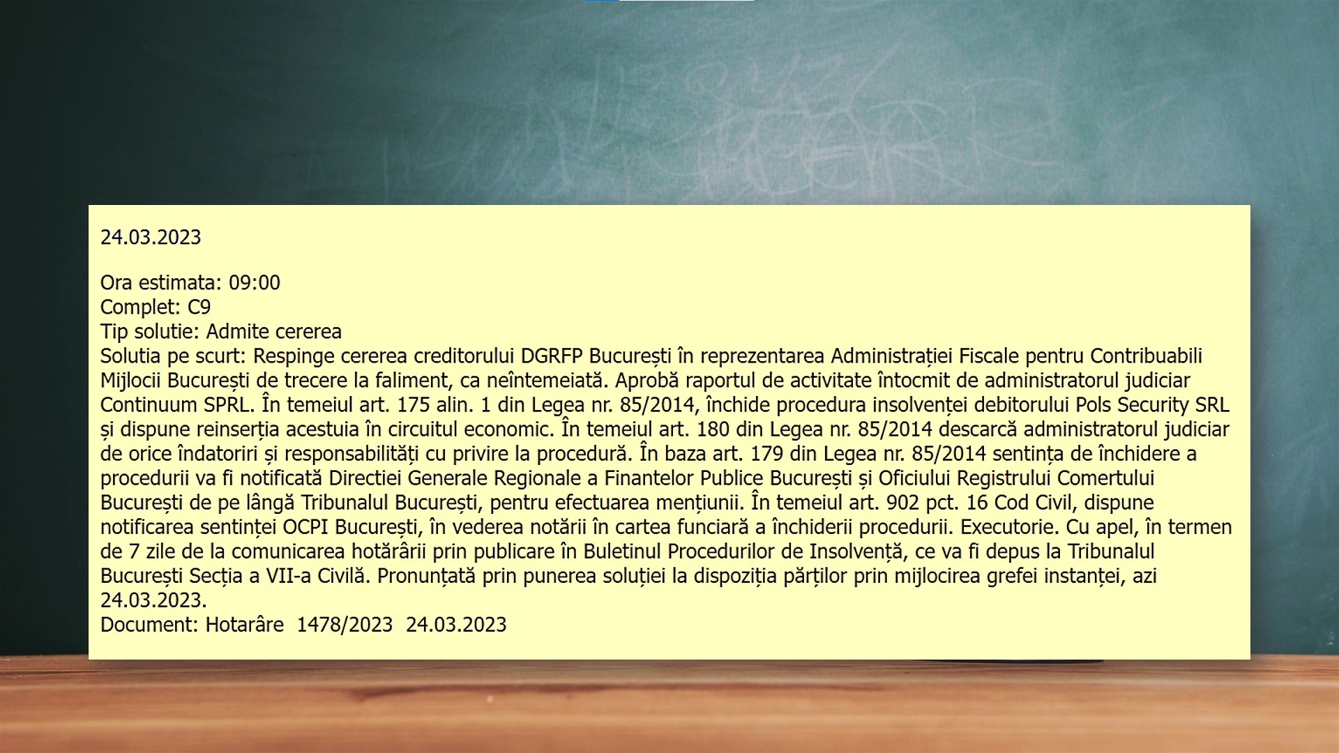 La doar 4 luni de la deschiderea procedurii, societatea se afla deja in procedură de reorganizare judiciară. Astăzi s-a închis procedura de insolvență cu reinserția societății în circuitul economic.