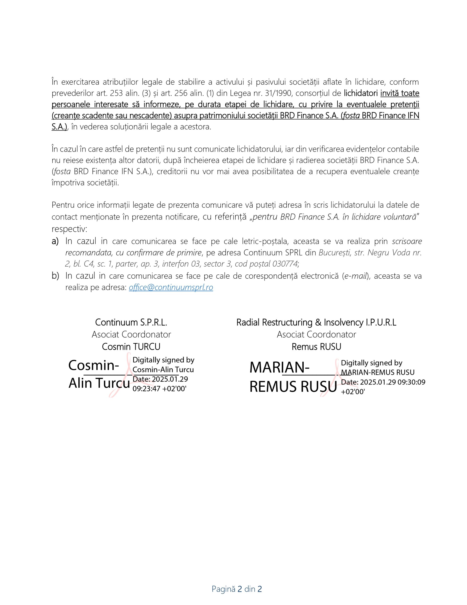 Prin Hotărârea AGEA nr. 92/27.09.2024 consorțiul practicienilor în insolvență CONTINUUM SPRL și RADIAL RESTRUCTURING & INSOLVENCY I.P.U.R.L. a fost desemnat lichidator al BRD Finance S.A. (fosta BRD Finance IFN S.A.), în lichidare voluntară / en liquidation volontaire / in voluntary liquidation (CIF: RO16334236, J2004006083401), cu sediul în București, Șoseaua Olteniței nr. 2, sector 4