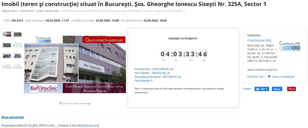Bio Ortoclinic SRL, aflată în procedură de reorganizare judiciară în baza legii nr. 85/2014, valorifică prin licitație publică următorului activ: