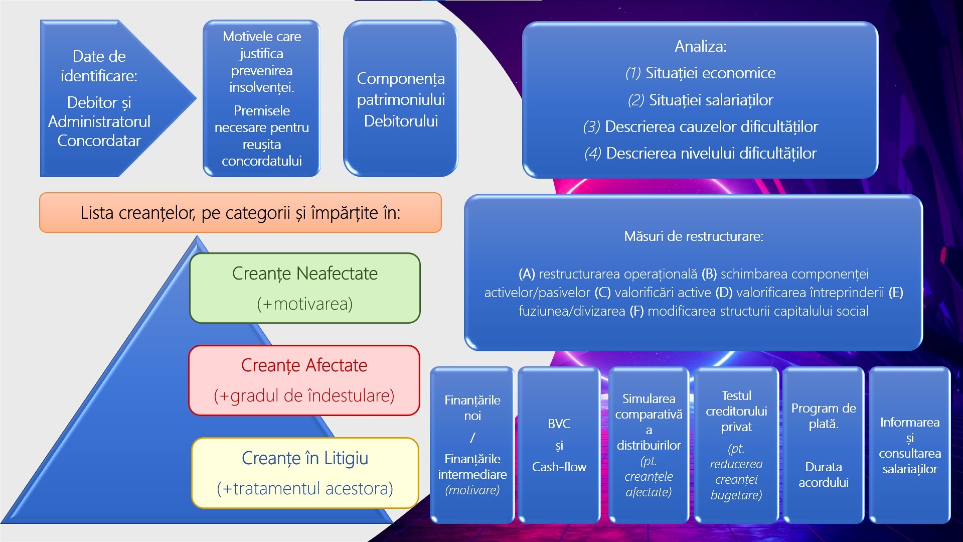 Procedurile de prevenire a insolventei sunt proceduri de restructurare hibrid. Acestea, reprezintă un amestec între libertatea contractuala si intervenția instanțelor judecătorești. Legea 85/2014, astfel cum a fost modificată prin Legea nr. 216 din 14 iulie 2022, publicată în M. Of. nr. 709 din 14 iulie 2022, reglementează sub titlul „Proceduri de prevenire a insolventei”, doua astfel de proceduri: Acordul de restructurare si Concordatul preventiv. Elementele comune celor două proceduri sunt: