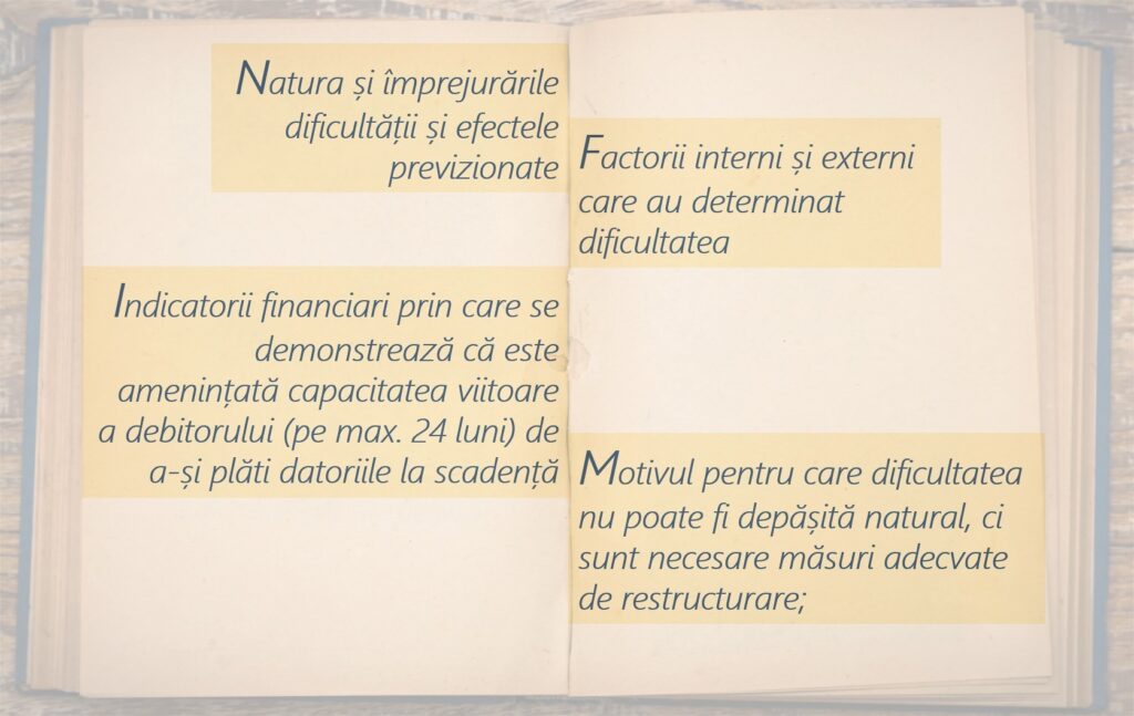 Acordul de restructurare trebuie întocmit pe baza unor informații financiar contabile și a unui raport de evaluare, nu mai vechi de 6 luni și trebuie să conțină: