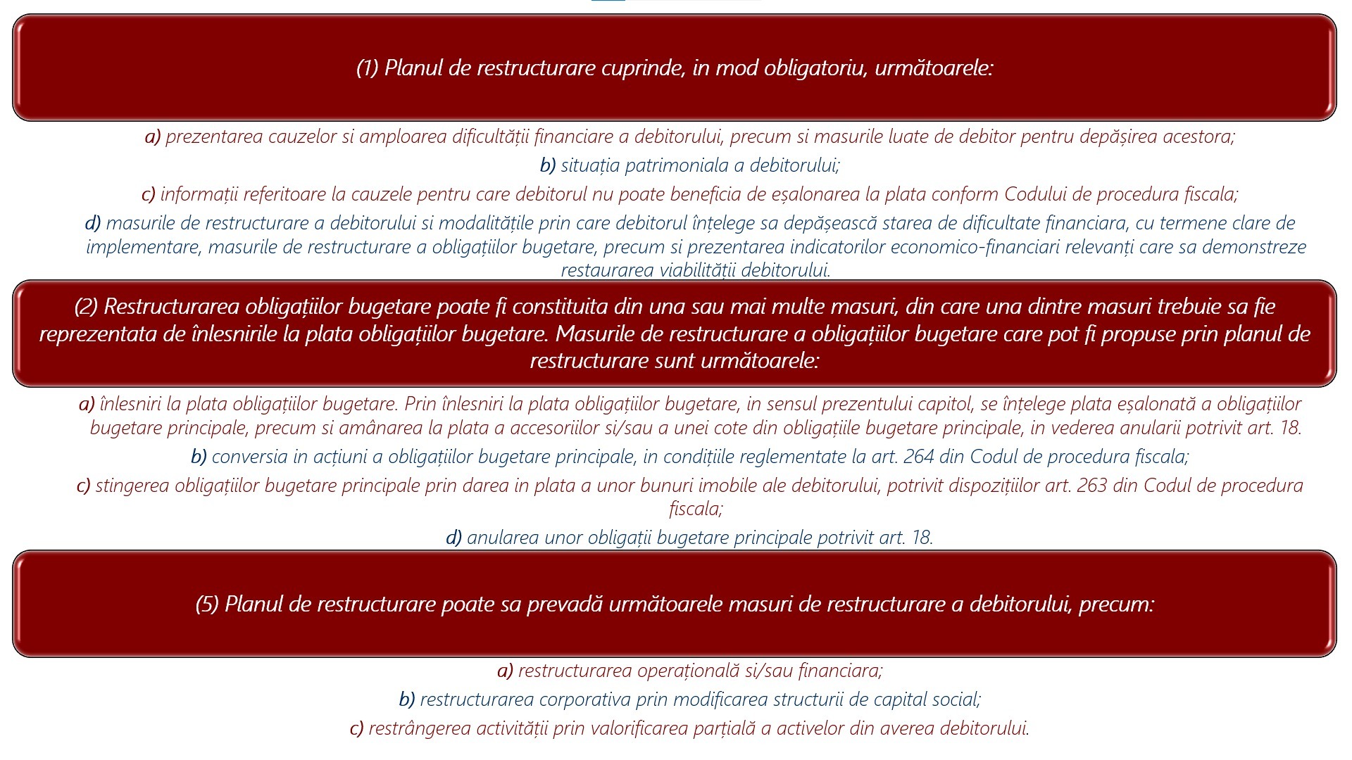 O.G. 6/2019 privind instituirea unor facilitați fiscale. Nu exista o definiție a restructurării dar este prevăzut ce trebuie sa cuprindă un plan de restructurare: