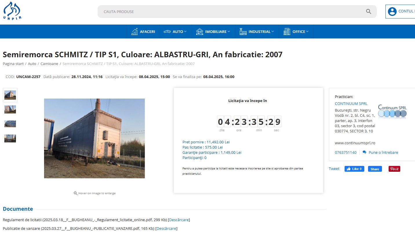 Semiremorca SCHMITZ / TIP S1, Serie sașiu: WSMS6980000753805, Culoare: ALBASTRU-GRI, An fabricatie: 2007, Nr. Inmatriculare: AG-19-JSM, Carte de identitate: J950364. Prețul de pornire: 6.567 Lei + TVA.