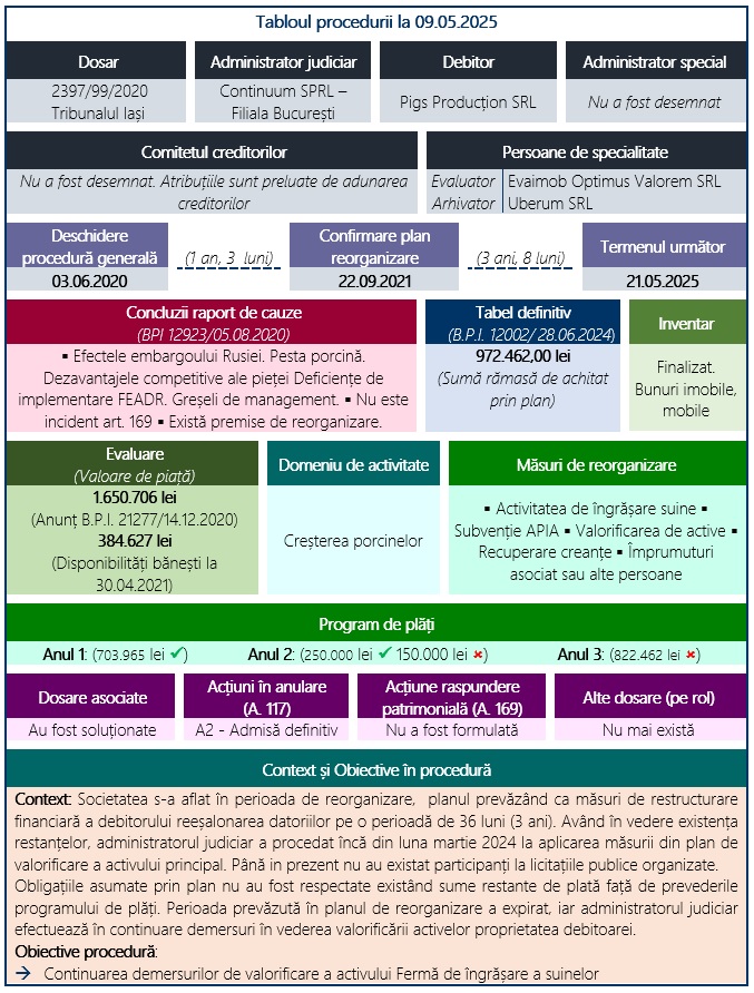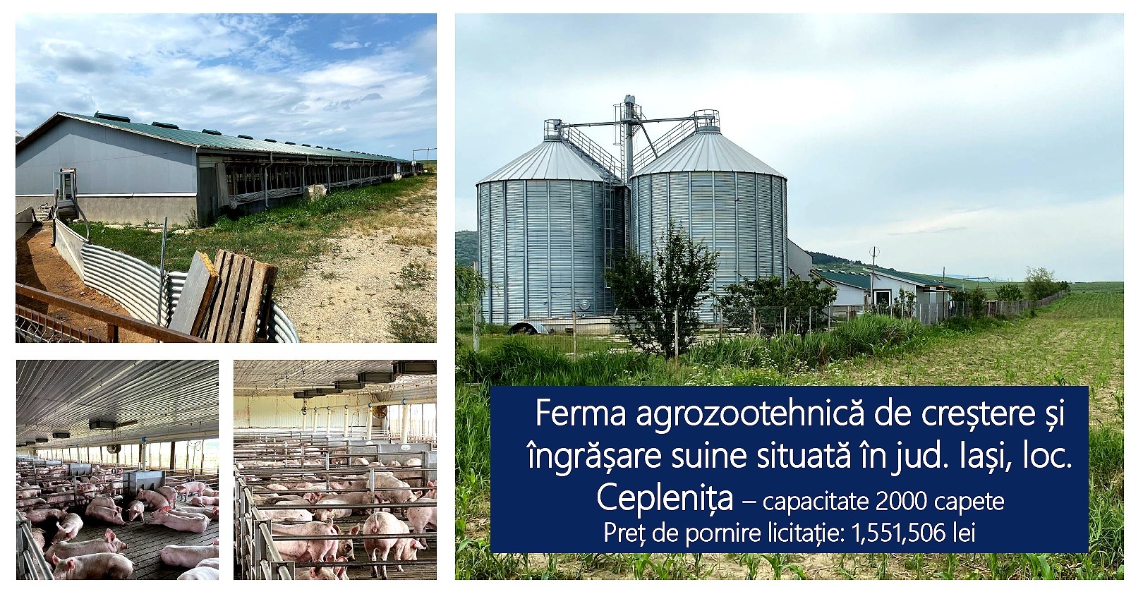 Fermă de îngrășare a suinelor – ansamblu independent și funcțional de bunuri imobile și mobile la prețul de pornire de 1.091.882 lei. Cu privire la TVA se vor aplica normele și reglementările Codului Fiscal în vigoare la data transferului dreptului de proprietate, pentru fiecare tip de active în parte