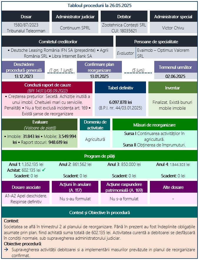 În temeiul art. 137 alin. (2) din Legea 85/2014, administratorul judiciar convoacă adunarea generală a creditorilor societății ZOOTEHNICA CONȚEȘTI SRL la data de 10.01.2025, ora 11:00, la sediul procesual ales al administratorului judiciar, situat în București, str. Negru Vodă nr. 2, bl. C4, sc. 1, parter, ap. 3, interfon 03, sector 3, cod poștal 030774, având ca ordine de zi: